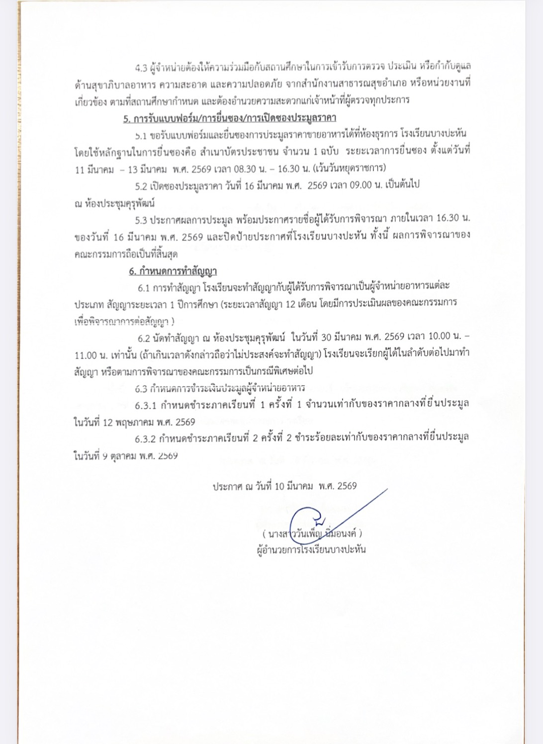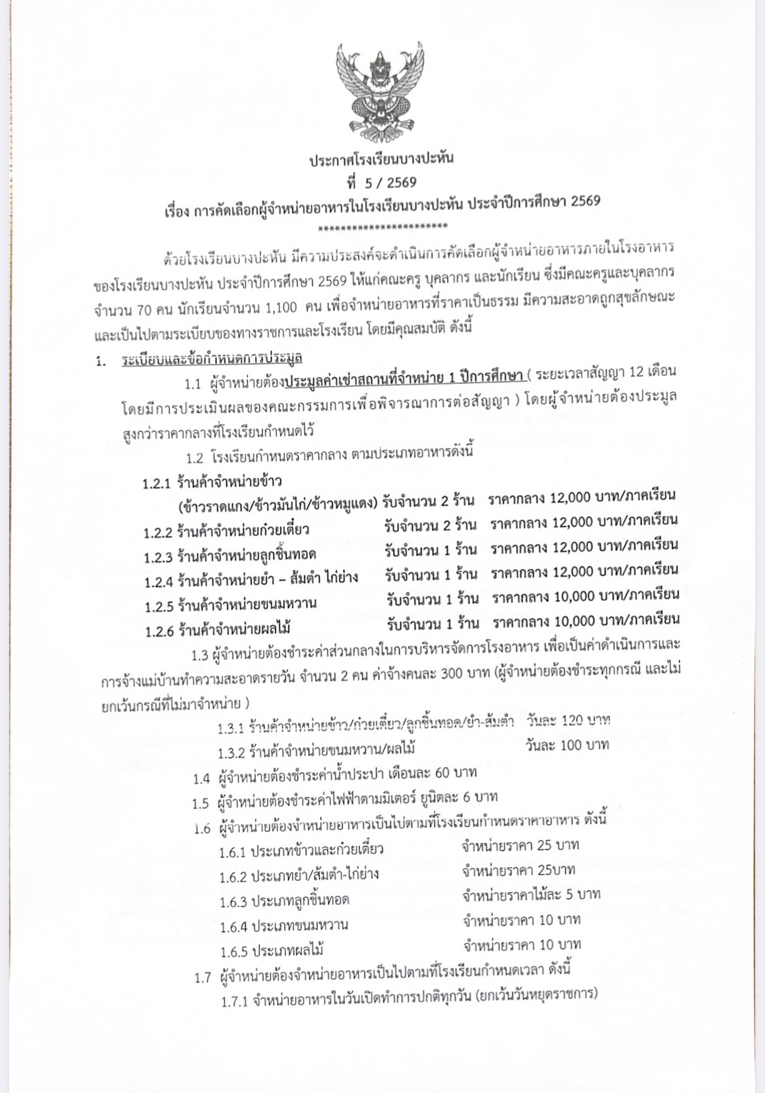 ประกาศ เรื่อง การคัดเลือกผู้จำหน่ายอาหารในโรงเรียนบางปะหัน ประจำปีการศึกษา 2569
