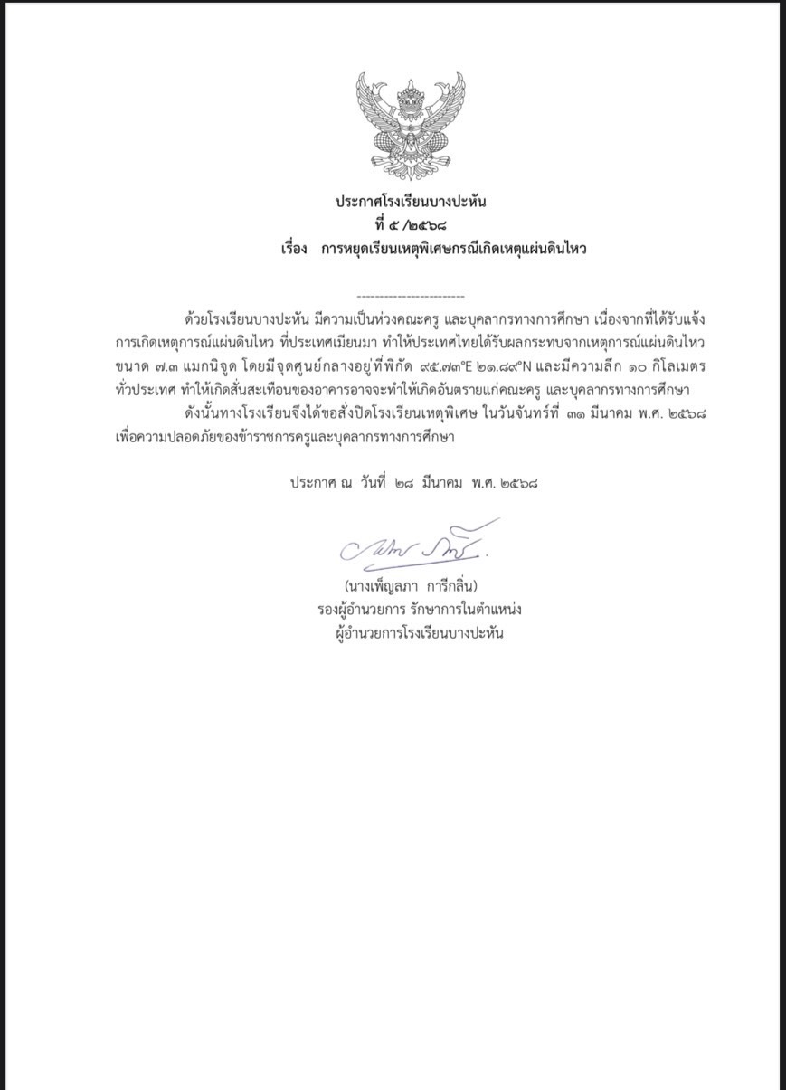 ประกาศ เรื่อง การหยุดเรียนเหตุพิเศษกรณีการเกิดเหตุแผ่นดินไหว