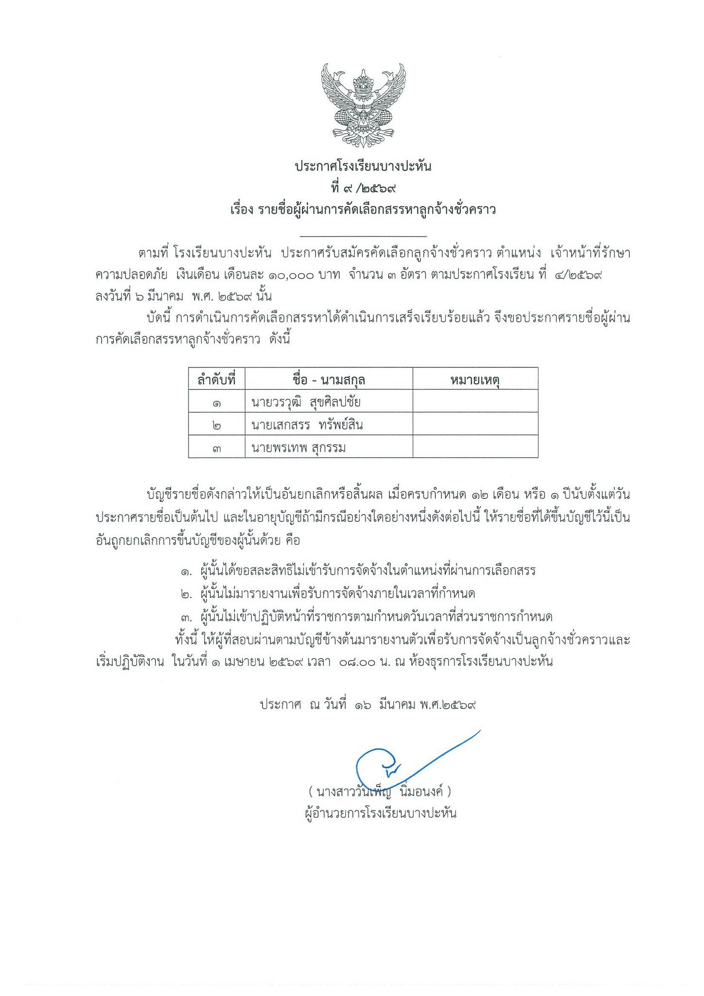 ประกาศ รายชื่อผู้ผ่านการคัดเลือกสรรหาลูกจ้างชั่วคราว (เจ้าหน้าที่รักษาความปลอดภัย)