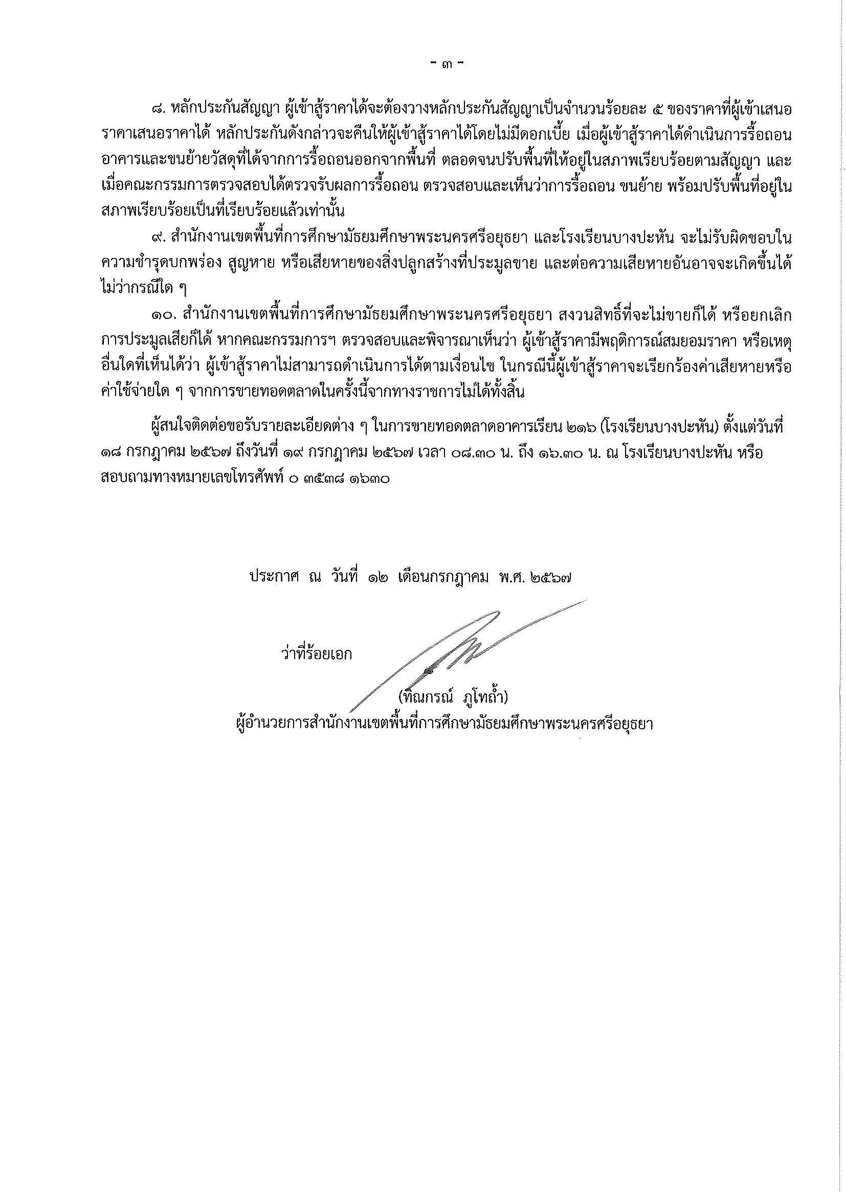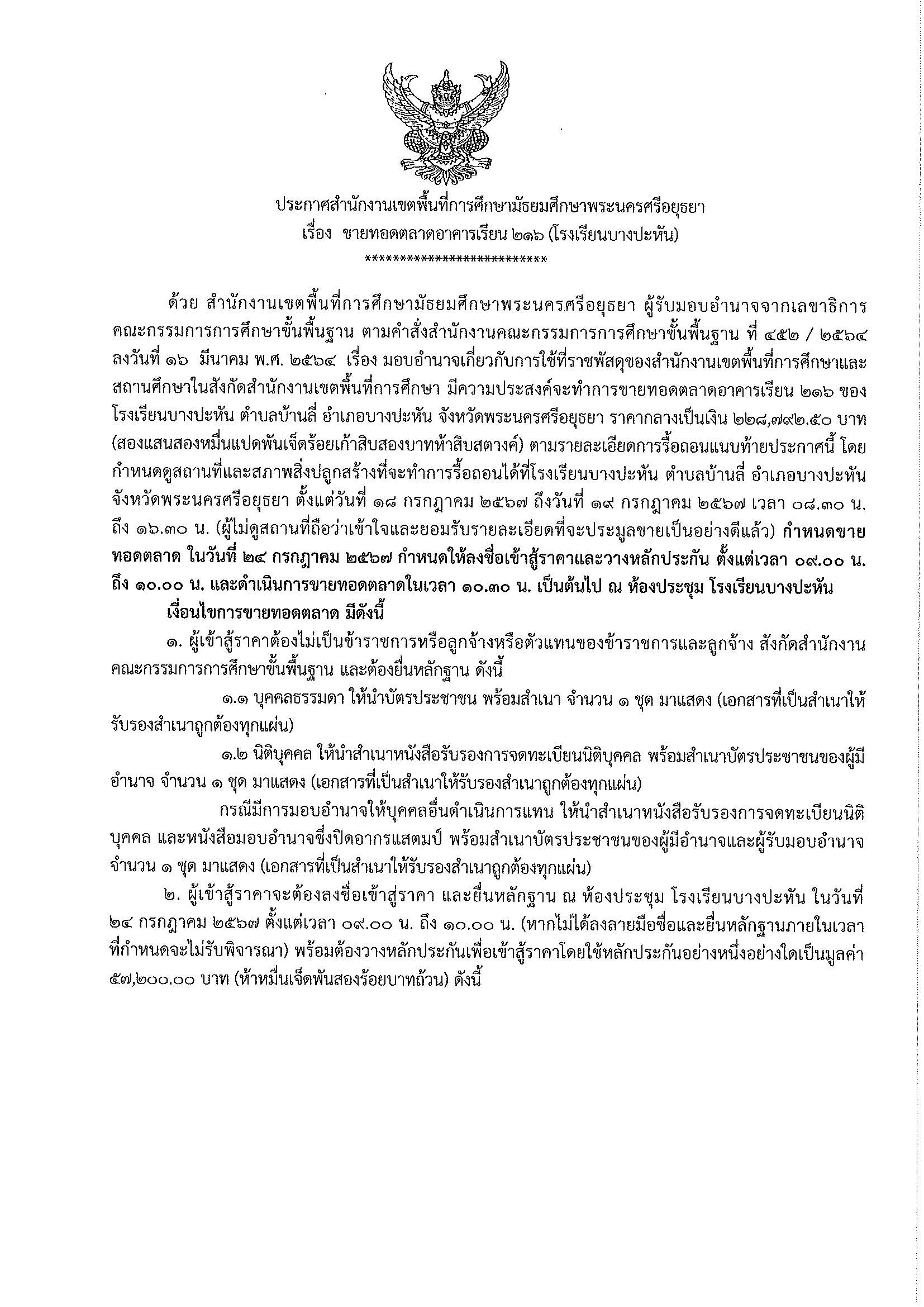 ประกาศ สพม.อย. เรื่อง ขายทอดตลาดอาคารเรียน 216 (โรงเรียนบางปะหัน)